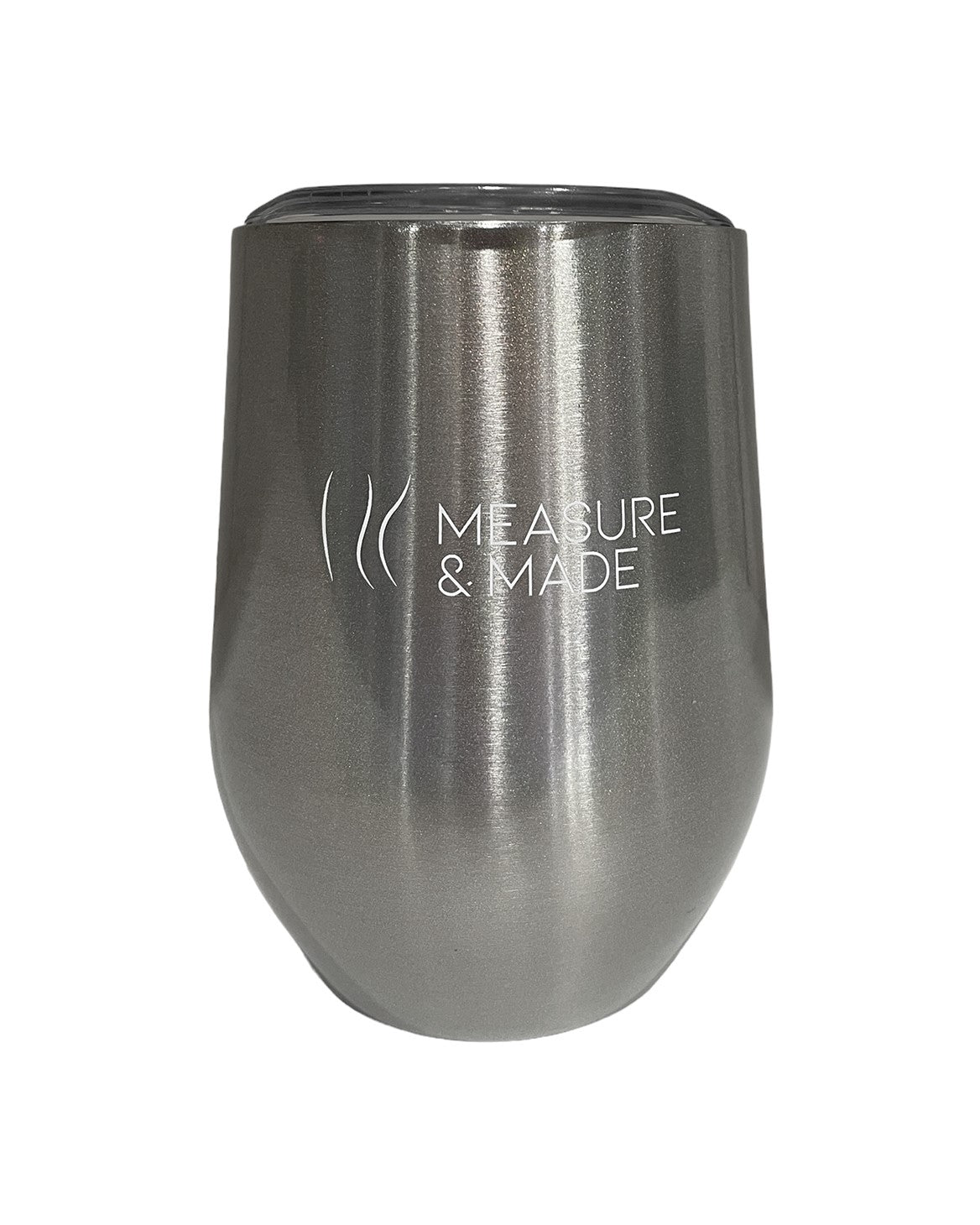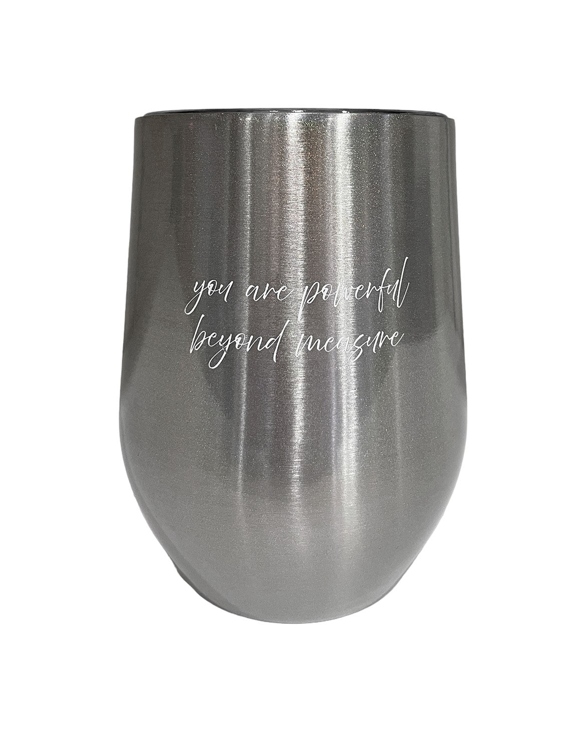 11 oz. double wall brushed stainless steel stemless BYOB tumbler. Iridescent finish, stainless steel outer with a stainless inner. Clear Tritan plastic push on, sip through lid. 5" tall.